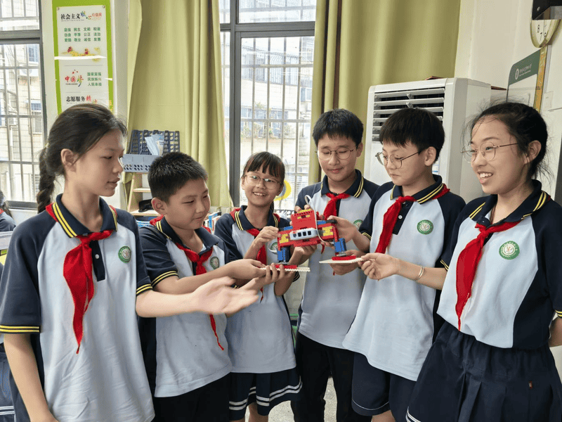 最让学生们兴奋的,莫过于动手实践环节。在叮叮老师的指导下,同学们以小组合作的形式,亲手拼装“扫地机器人”,并发挥创意为模型设计独特造型与个性名称,如“天安门一号”等充满想象力的作品纷纷诞生。从硬件组装到线路连接,再到编程刷卡、调试启动,孩子们在一步步实践中真切体会到“让想法变成现实”的成就感。编程不再遥远,AI不再神秘,科技的种子正是在这样的实践中悄悄生根发芽。