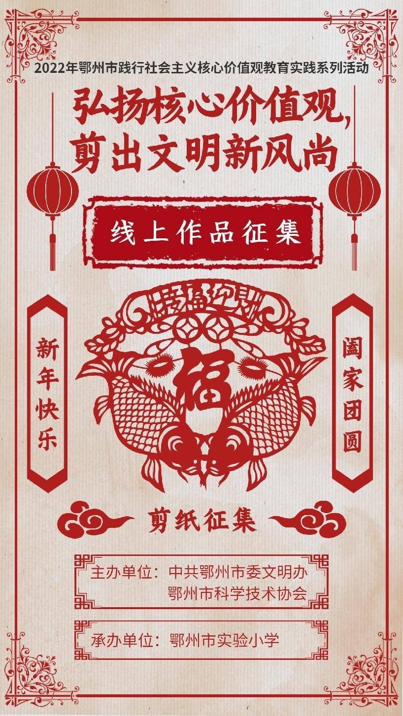为深入推进“社会主义核心价值观”宣传,推动鄂州市民间剪纸艺术的传承发展,打造具有鄂州特色的时代文化,营造和谐社区,共建品质鄂州,以鄂州特色民间文化 “剪纸艺术”为载体,结合时代精神,现启动2022年“社会主义核心价值观剪纸”作品征集大赛活动,面向社会公开征集剪纸作品。